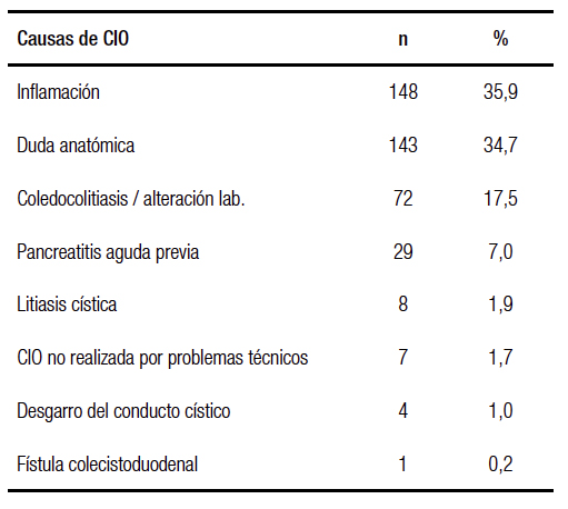 De las 409 CIO realizadas en nuestra serie, 303 fueron realizadas por no cumplir los criterios de Strasberg. En 109 pacientes se realizó CIO por presentar litiasis coledociana no resuelta por CPRE, alteración en el hepatograma prequirúrgico o bien por pancreatitis aguda biliar previa.