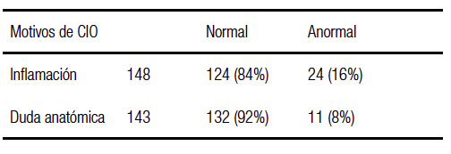 Tomando como referencia un resultado de CIO normal cuando el contraste tiñe por completo el árbol biliar (conducto cístico, colédoco, CHC, CHD, CHI y sectoriales), existe buen pasaje del contraste a duodeno sin imágenes negativas en su interior, ausencia de fuga de contraste y una vía biliar expedita. En caso de duda anatómica los resultados fueron normales en el 92% vs. 84% cuando existía un gran componente inflamatorio.
