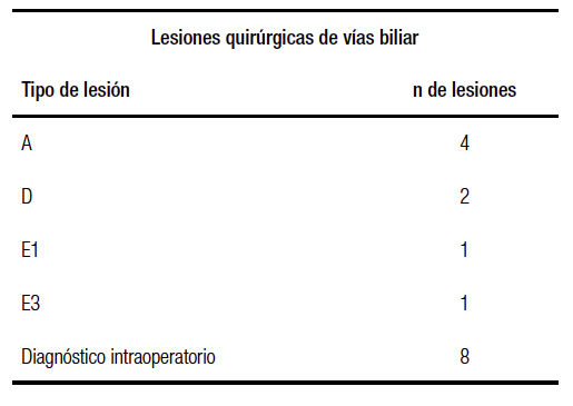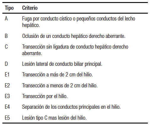 Se utilizó la clasificación de Strasberg para describir el tipo de lesión quirúrgica de vía biliar (Tabla 1).15
