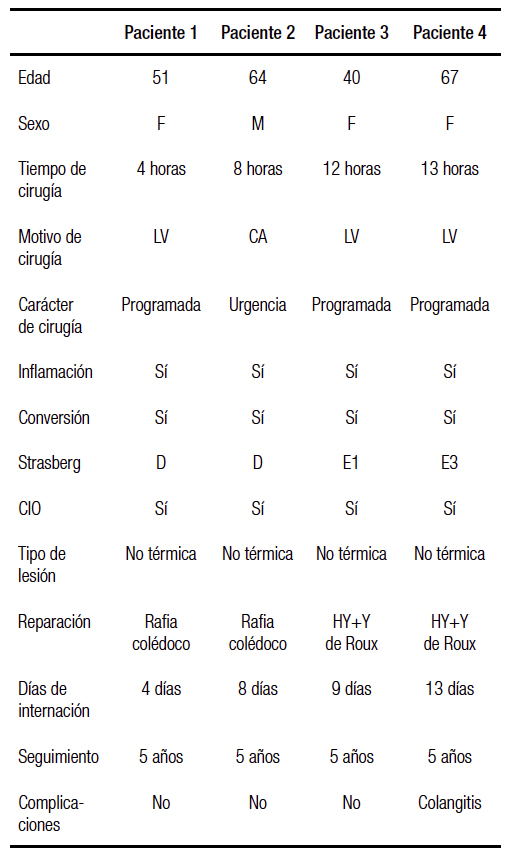Los principales factores contribuyentes en la producción de las lesiones son la inflamación y las variaciones en la anatomía de la vía biliar. El mecanismo de lesión fue sección con tijera de la vía biliar. No hubo lesiones térmicas. La reparación requirió la conversión en todas las lesiones graves. Se realizó mediante una rafia al colédoco en el caso de las lesiones tipo D y una hepático y bihepáticoyeyuno anastomosis en el tipo E1 y E3 respectivamente. No hubo lesiones vasculares asociadas (Tabla 7).