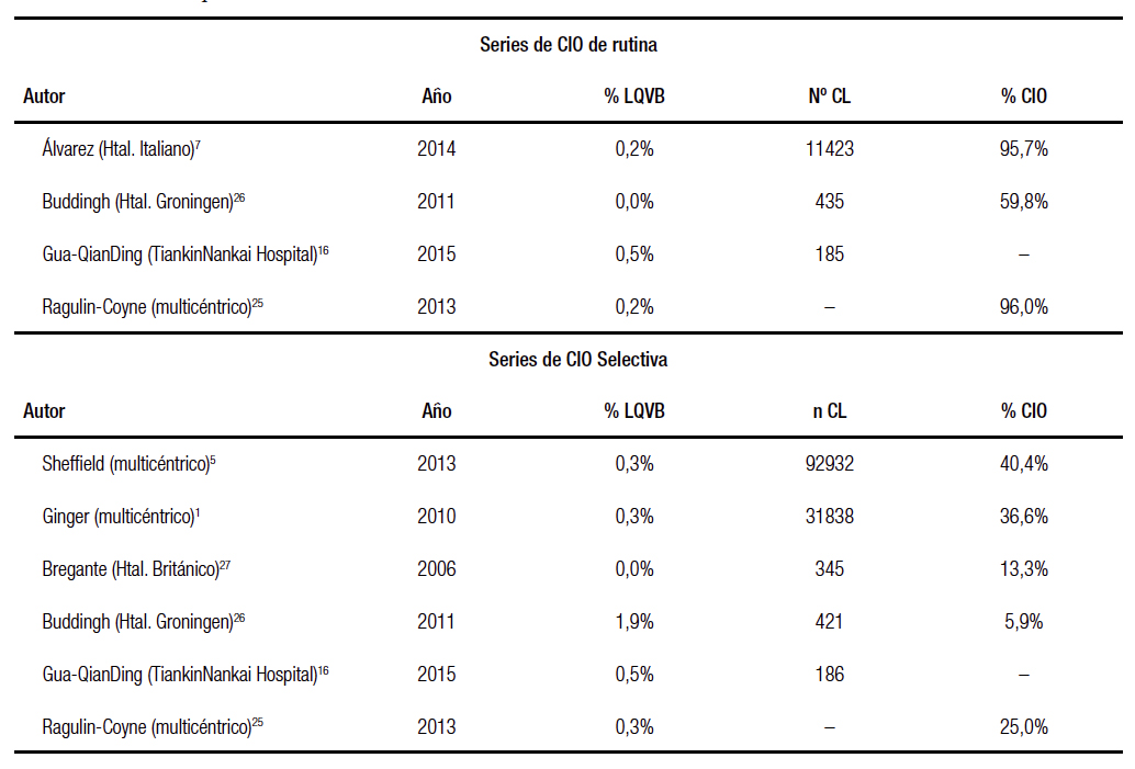 Nuestra prevalencia de LQVB es similar a los centros que realizan CIO de forma rutinaria (Tabla 8). Es amplia la literatura que avala nuestra conducta.