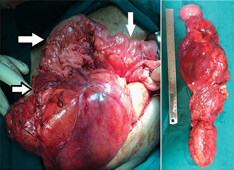 Mass is extending into perirenal space abutting the renal cortex. Solid component showing low density areas are seen within the mass. It is crossing to midline anterior to aorta. After undergoing all the relevant investigations, patient was declared fit for surgery and was taken for laparotomy, a midline incision was made and the findings revealed were as follows (Figure 2):