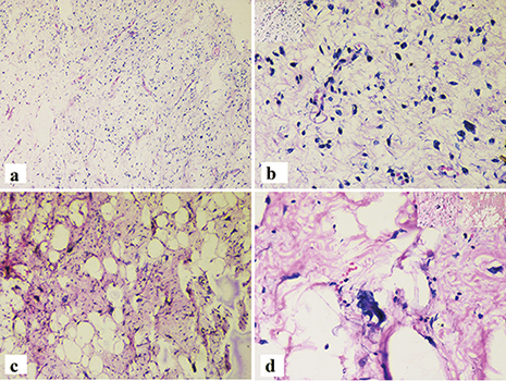 Meticulous dissection was done, and mass was freed from adhesions and removed into including the gerotas fascia. Bowel was saved by blunt dissection of the tumour. Abdomen was closed in layers. On histopathology, it shows multilobulated tumour composed of variable sized adipocytes with presence of scattered lipoblast, floret cells separated by cellular septa. Bizarre lipoblast was seen. Tumour exhibiting abundant hypocellular myxoid area with delicate branching capillary network. Final diagnosis made was myxoid liposarcoma (Figure 3).