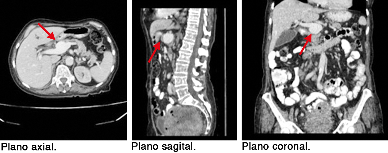 Se presenta el caso de una paciente de sexo femenino de 81 años, asintomática y sin hallazgos relevantes al examen físico, que se encuentra en seguimiento por cáncer de colon con metástasis hepática. Se le realiza una tomografía computada (TC) de tórax, abdomen y pelvis, en la que se evidencia una dilatación sacular de 31 mm de diámetro a nivel de la vena porta (Figura 1). El diagnóstico radiológico fue el de un aneurisma de la vena porta. Se tomó una conducta expectante y la paciente continuó asintomática, en seguimiento tanto clínico como mediante imágenes.