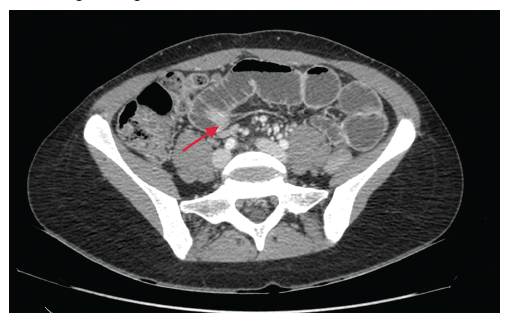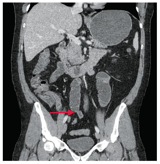 Paciente de sexo femenino de 30 años, con el único antecedente quirúrgico de haber sido operada el año 2002 por un cuadro de peritonitis apendicular por vía abierta. La paciente consulta por sus propios medios en la unidad de urgencia de nuestro centro por un cuadro de 72 horas de evolución, caracterizado por distensión abdominal progresiva, dolor abdominal difuso tipo cólico, vómitos y ausencia de eliminación de gases y deposiciones. Al examen físico se evidencia la cicatriz de la laparotomía mediana supra e infraumbilical (LMSIU), dolor a la palpación, sin irritación peritoneal y ruidos hidroaéreos disminuidos. Se solicita una tomografía axial computarizada (TAC) de abdomen y pelvis con contraste. La TAC mostró dilatación patológica de asas de intestino delgado, con un cambio de calibre hacia el hipogastrio, con colapso de asas a distal y sin signos de sufrimiento intestinal (Figura 2).