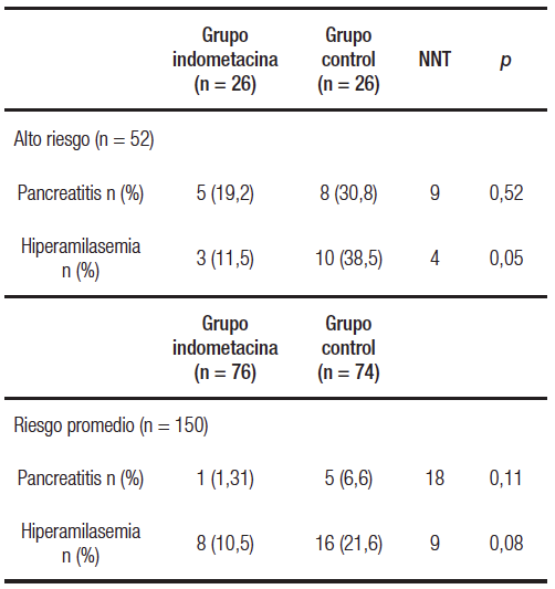 Pese a la dispersión numérica que implica la división en grupos de una muestra reducida, con la consecuente pérdida de poder estadístico, los resultados del subanálisis de los pacientes con alto y bajo riesgo nos permitieron ver que la disminución de casos de pancreatitis e hiperamilasemia es más acentuada con la administración de indometacina, tanto en la diferencia porcentual como en el NNT.