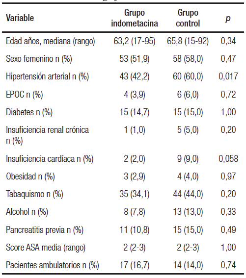 Con respecto a las variables demográficas ambos grupos fueron homogéneos en cuanto a sexo, edad, comorbilidades, score de ASA y procedimientos realizados de forma programada. La excepción fue que hubo un número de pacientes hipertensos significativamente mayor en el grupo control que en el grupo indometacina (60 vs. 43 pacientes, p = 0,017) (Tabla 1).
