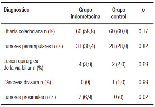 Con respecto a los diagnósticos que motivaron la realización del procedimiento, la causa más frecuente fue la litiasis coledociana, seguida por los tumores de la región periampular. La distribución entre los grupos también fue homogénea, a excepción de que había más casos de tumores de la vía biliar proximal en el grupo indometacina (7 vs. 0 pacientes, p = 0,02) (Tabla 2).