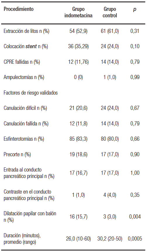 La distribución de los procedimientos realizados en cada grupo también fue similar. Tampoco se encontraron diferencias entre ambos grupos en los factores de riesgo de pancreatitis post CPRE, a excepción de que en el grupo indometacina se realizó más frecuentemente la dilatación con balón (16 vs. 3 pacientes, p = 0,004) y fue menor la duración del procedimiento (26,0 ± 9,5 vs. 30,2 ± 7,3 minutos, p = 0,0005) (Tabla 3).