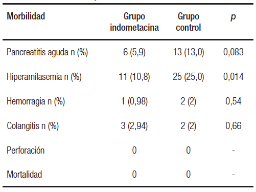 La morbilidad asociada al procedimiento estuvo representada principalmente por episodios de pancreatitis aguda, siendo leve en todos los pacientes, con 13 casos (13,0%) en el grupo control y 6 en el grupo indometacina (5,9%) (p = 0,083). El riesgo relativo (RR) fue 0,45 (intervalo de confianza del 95% (IC 95%): 0,16-1,22), la reducción del riesgo relativo (RRR) 0,55 (IC 95%: - 0,22-0,84), la reducción del riesgo absoluto (RRA) 0,07 (IC 95%: - 0,02-0,14) y el número necesario a tratar (NNT) 14 (IC 95%: 7-infinito).