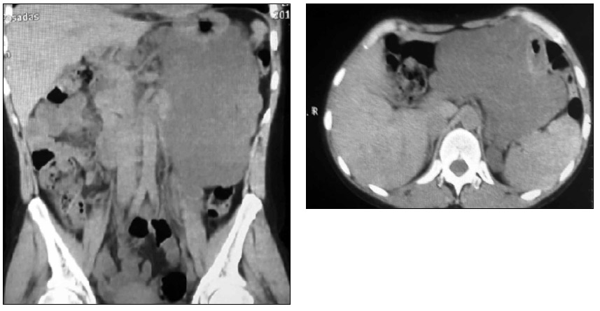 Con el fin de estadificar la enfermedad de base se solicita una tomografía de tórax y abdomen (Figuras 1 y 2), cuyo informe dice: a nivel centro abdominal, se observa una lesión quística multilobulada interhepatogástrica y retrogástrica gigante que ocupa todo el hemiabdomen izquierdo.