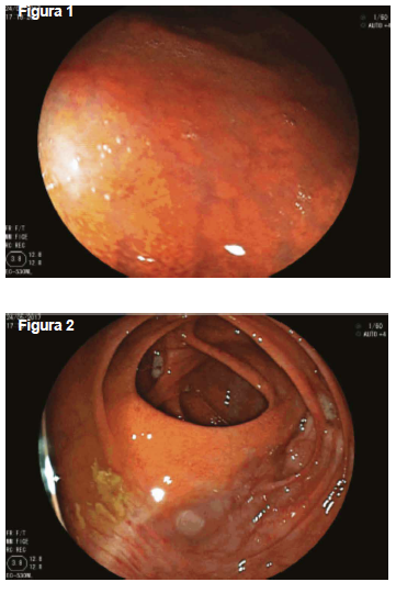 Concurrió al Servicio de Gastroenterología de nuestra institución derivado por su médico de cabecera por aumento en el número de deposiciones y anemia de trastornos crónicos. Al examen físico, el abdomen es normal. En la videocolonoscopía se observó en forma localizada en ciego, mucosa congestiva, granular, de color naranja intenso (Figuras 1 y 2). Se tomaron biopsias y las muestras fueron enviadas a anatomía patológica.