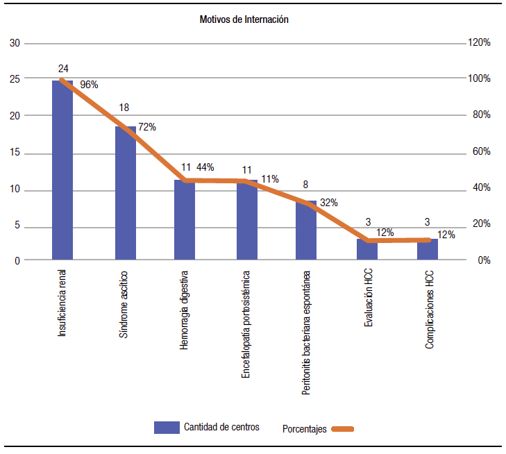 La insuficiencia renal y el síndrome ascítico edematoso (96% y 72% de los centros, respectivamente) fueron las causas de admisión más frecuentes. La magnitud de estos porcentajes (particularmente el de IR) refleja un hecho habitual, ya mencionado: la coexistencia de complicaciones en el momento de la admisión. Sin embargo, es llamativa la reducida proporción de infecciones (PBE u otras) como causa exclusiva de internación. Es posible que el diagnóstico de las mismas se haya demorado o que estas hayan tenido, en su presentación, un carácter predominantemente nosocomial.