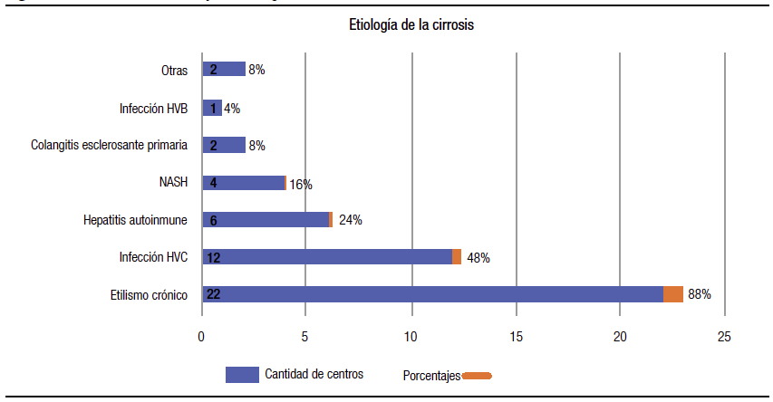 La realidad argentina en relación con esta patología es similar a la de los países desarrollados, al menos en los aspectos etiológicos dominantes. Sin embargo, existen notables diferencias en relación con los recursos de infraestructura disponibles. Estas similitudes y divergencias, no obstante su certidumbre, no resultan de registros estadísticos, sino de una percepción objetiva. El presente estudio, realizado en cirróticos institucionalizados, permite confirmar lo mencionado en relación con las causas de cirrosis: el alcohol y la infección por HCV son los agentes etiológicos más prevalentes en nuestro medio. Además, es destacable el rol creciente del NASH, que ocupa el 4º lugar en este ranking.