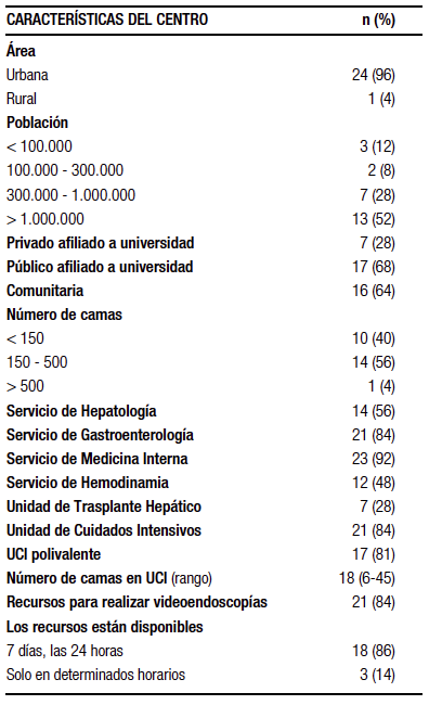Veinticinco (50%) de los centros hospitalarios invitados respondieron la encuesta: 23 de Argentina, 1 de Uruguay y 1 de Paraguay (***). Veinticuatro de ellos (96%) están localizados en áreas urbanas, 13 (52%) en ciudades con más de 1.000.000 de habitantes. De las instituciones, 14 (56%) poseen Servicio de Hepatología y 7 (28%) una Unidad de Trasplante Hepático. El Servicio de Clínica Médica está presente en la gran mayoría (n: 23; 92%), del mismo modo que el Servicio de Gastroenterología (n: 21; 84%). La accesibilidad a estudios videoendoscópicos es factible en el 100% de los Servicios de Gastroenterología, y están disponibles 7 días/24 horas en 18 de los centros (86%) (Tabla 1).