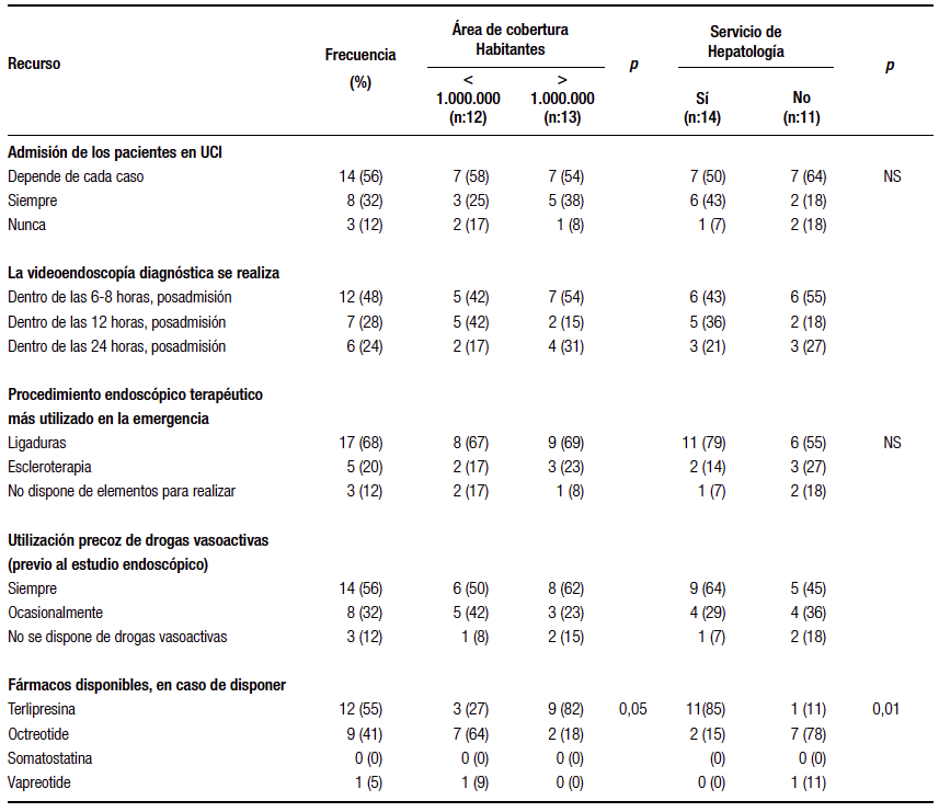 La hemorragia variceal es la complicación más grave de la cirrosis. Las recomendaciones vigentes incluyen: ingreso a UTI, control hemodinámico y monitoreo de signos vitales, administración precoz de drogas vasoactivas, ATB y la realización del estudio endoscópico (diagnóstico y terapéutico) dentro de las 12 horas posteriores a la admisión.6, 7, 23El cumplimiento de estas medidas se ha asociado a una importante disminución de la mortalidad, no obstante esta persiste en un 15-25%.23 En este estudio observamos que entre el 50% y el 68% de los centros cumplimenta todas estas medidas, aunque un 12% carece de los recursos fundamentales (UTI, drogas vasoactivas, terapéutica endoscópica). Solo un 56% de los centros admite “siempre en UTI” (recomendación formal). Esta actitud es aceptable en la medida que el argumento para este proceder esté basado en la limitación de camas y no en una subestimación de la gravedad del cuadro. El paciente puede ser admitido en una Unidad de Cuidados Intermedios (UCI), pudiendo allí recibir la misma atención médica y cuidados de enfermería que en una UTI. Finalmente, el acceso a las terapias más sofisticadas y onerosas (TIPS, stents esofágicos) queda limitado a un pequeño grupo de instituciones, convertidas en centros de referencia para estas instancias terapéuticas.