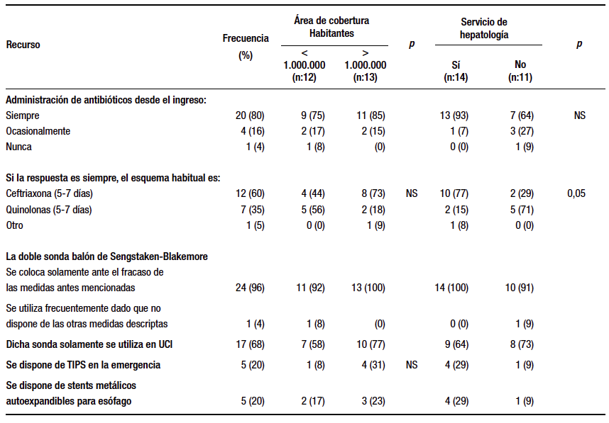 La admisión de los pacientes sangrantes “siempre en UTI” solo se cumple en el 32% de los centros, mientras que en la mayoría (56%) la decisión es variable. La videoendoscopía se realiza entre las 6 y 8 horas de la admisión en el 48% de las instituciones y antes de las 12 h en el 76%. La terapéutica endoscópica más utilizada es la ligadura de las várices (68%), aunque este recurso no está disponible en el 12% de los centros. Los fármacos vasoactivos se administran precozmente (antes del estudio endoscópico) en el 56% de los centros, siendo la terlipresina la droga más utilizada. Esta conducta predomina en los centros localizados en áreas con más de 1.000.000 de habitantes y con Servicio de Hepatología respecto de las áreas menos pobladas y que carecen de ese servicio (82% vs. 27% [p < 0,05] y 85% vs. 11% [p < 0,01]; respectivamente) (Tabla 2a). Los ATB se indican siempre desde el ingreso en el 80% de los centros y la ceftriaxona es la prescripción predominante (60%). Esta actitud también es más prevalente en áreas con más de 1.000.000 de habitantes y que cuentan con Servicio de Hepatología respecto de áreas menos pobladas y que carecen de ese servicio (73% vs. 44% [NS] y 77% vs. 29% [p < 0,05]; respectivamente). El 20% de los centros dispone de TIPS y stents esofágicos autoexpandibles para la emergencia (Tabla 2b).