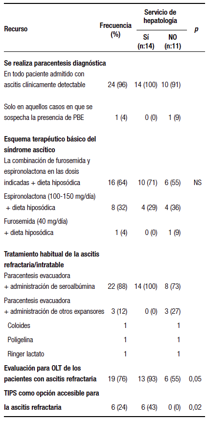 La paracentesis diagnóstica se realiza a todo paciente admitido con ascitis clínicamente detectable en el 96% de los centros, y la combinación de diuréticos (espironolactona + furosemida) + dieta hiposódica es el esquema terapéutico más utilizado (64% de los centros). En los casos de ascitis refractaria o intratable, el 88% de los centros realiza paracentesis evacuadora asociada a sero-albúmina. El TIPS es una opción terapéutica en el 24% de las instituciones y en el 76% se realiza evaluación para LTX, ambas circunstancias predominantes en centros con Servicio de Hepatología (93% vs. 55% [p < 0,05] y 43% vs. 0% [p < 0,02], respectivamente) (Tabla 3).