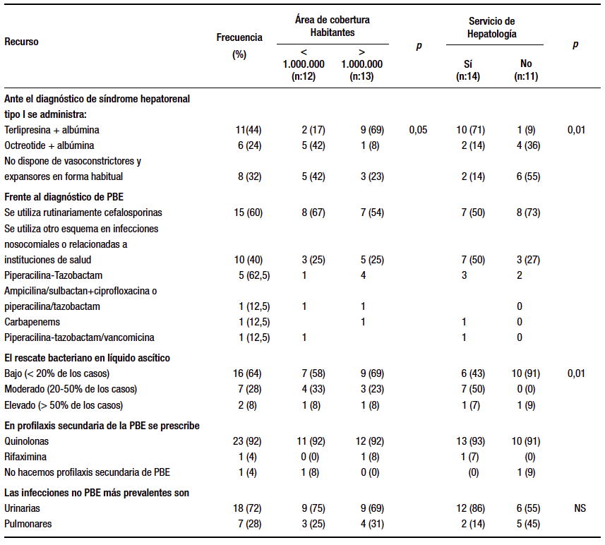 Ante el diagnóstico de síndrome SHR tipo I (actualmente denominado SHR-AKI), el tratamiento recomendado como primera opción terapéutica (terlipresina + albúmina) se indica en el 44% de los centros; siendo su utilización más frecuente también en centros localizados en grandes áreas urbanas y con Servicio de Hepatología (69% vs. 17% [p < 0,05] y 71% vs. 9% [p < 0,01; respectivamente]). Es importante destacar que un 32% de los centros no dispone de dichos recursos en forma habitual, en su mayoría localizados en áreas urbanas más pequeñas y sin Servicio de Hepatología. Ante el diagnóstico de PBE se utilizan cefalosporinas en el 60% de los centros. En el 64% de las instituciones el rescate bacteriano es bajo, a diferencia de aquellas que disponen de Servicio de Hepatología, en las que la tasa de rescate es moderada (50% vs. 0%; con y sin SH, respectivamente [p < 0,01]). En la mayoría (92%) de los centros se utilizan las quinolonas como profilaxis secundaria. Las infecciones bacterianas no PBE más frecuentes son las urinarias (72%) y las pulmonares (28%) (Tabla 4).
