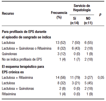 En la profilaxis de la EPS durante el sangrado variceal, la lactulosa es la opción más utilizada (52%), mientras que el 32% la administra asociada a quinolonas o rifaximina. A la inversa, para la EPS crónica, esta última combinación se utiliza en el 56% de los casos, siendo más frecuente en los centros con Servicio de Hepatología (79% vs. 27%, con y sin SH, respectivamente [p < 0,05]) (Tabla 5).