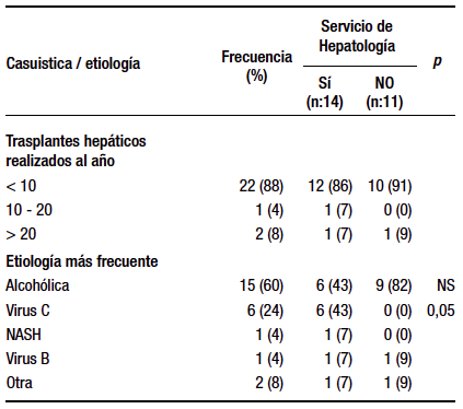 En la mayoría (88%) de los centros se realizan menos de 10 procedimientos por año. Solo en 2 de ellos se realizan más de 20. La etiología alcohólica es la causa más frecuente (60%), seguida del HCV (24%). Esta última predomina en los centros con Servicio de Hepatología (43% vs. 0%, con y sin SH, respectivamente [p < 0,05]) (Tabla 6).