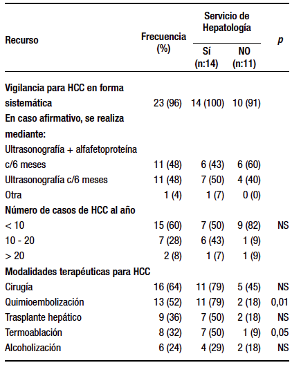 La vigilancia para HCC se realiza sistemáticamente en el 96% de los centros. En aproximadamente la mitad (48%) mediante ultrasonografía y alfafetoproteína cada 6 meses, y en el resto solamente mediante ultrasonografía. En el 60% de los centros se diagnostican menos de 10 casos por año. La cirugía, la quimioembolización y el trasplante hepático son las modalidades terapéuticas más utilizadas (64%, 52% y 36% de los centros, respectivamente). Todas estas opciones terapéuticas son más accesibles en los centros con Servicio de Hepatología respecto de aquellos sin este servicio, particularmente la quimioembolización y la termoablación (79% vs.18% [p < 0,01] y 50% vs. 9% [p < 0,05], respectivamente) (Tabla 7).