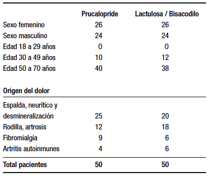 Se incluyeron 50 pacientes en el grupo prucalopride (grupo I) y 50 en el grupo lactulosa/bisacodilo (grupo II). Se necesitaron 105 pacientes para obtener la población a estudiar, ya que tres del grupo II y dos del grupo I no quisieron ser parte del protocolo.