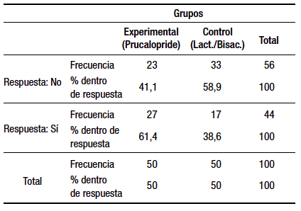 Abstract: The use of opioids for the treatment of chronic pain has increased. One of the most frequent adverse effects is chronic constipation (CC). Some prokinetics can be effective for its treatment. Objective. To evaluate the efficacy and safety of prucalopride compared to the combination of lactulose / bisacodyl in patients with CC induced by opioids. Material and methods. Prospective randomized study. Fifty patients were included in the prucalopride group and 50 in the lactulose / bisacodyl group treated for four weeks. They were evaluated with the Bristol visual scale (EB) and with a quality of life survey. Results. Prucalopride group proved to be safe and effective. It presented a statistically significant difference in the treatment of opioid-induced CC, compared with the lactulose / bisacodyl group. (X2 = 4.058 and p < 0.05); there were no significant differences in the response by age and sex in both groups. No patient abandoned the treatment due to adverse effects. Conclusions. The results would show that prucalopride is safe and effective in the treatment of CD secondary to opioids.
