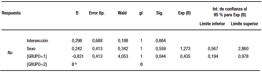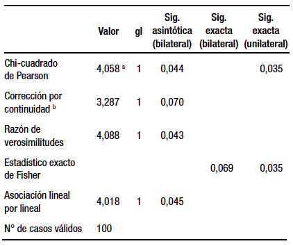Los datos fueron analizados estadísticamente con el software SPSS 22.0, versión en español. Se consideró una p < 0,05 como estadísticamente significativa y el intervalo de confianza del 95% para las evaluaciones de regresión logística. Para la comparación de grupos se utilizaron Chi2 de Pearson, razón de verosimilitudes y el test exacto de Fisher. Para corroborar estos resultados se realizó una regresión logística utilizando el sexo como covariable.