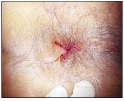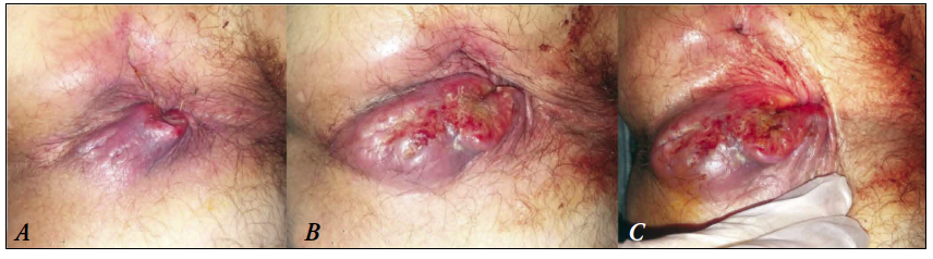 En abril de 2015 se presentó en el servicio de emergencias un paciente de sexo masculino de 60 años con dolor perianal asociado a una tumoración palpable en dicha zona. En el examen físico se encontraba afebril, normotenso, con tumoración dolorosa a nivel anal en el cuadrante posterior (hora 5-6), eritematosa y con fluctuación central. Presentaba antecedentes de tabaquismo, enolismo y múltiples drenajes de abscesos perianales en los últimos 10 años. No refirió al interrogatorio la práctica de sexo anal receptivo.