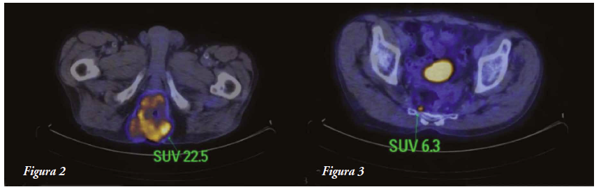 Dicha colección presentaba dos trayectos fistulosos que desembocaban en los planos cutáneos en la región glútea izquierda transcurriendo por el espacio interesfinteriano, y otro en región glútea derecha atravesando el esfínter externo. PET scan: engrosamiento irregular de la pared del recto inferior con compromiso del margen anal, que presentaba afectación de los tejidos blandos periféricos del periné. También presentaba compromiso de los músculos elevadores del ano. Marcado hipermetabolismo, SUV máximo 22,5. Adenopatía hipermetabólica por delante del alerón sacro con un SUV máximo de 6,3 (Figura 2 y 3). Impresión diagnóstica: lesión primaria rectal linfoproliferativa con extensión sobre partes blandas regionales con compromiso nodal locoregional.