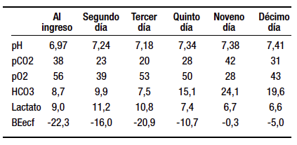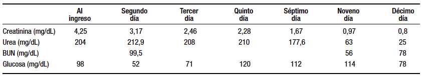 Los resultados de los exámenes de laboratorio se muestran en las Tablas 1 y 2, en donde resaltan la lesión renal aguda y una acidosis metabólica de brecha aniónica elevada e hiperlactacidemia. Inició hidratación endovenosa y antibióticos de amplio espectro, evolucionó con mejoría logrando estabilidad hemodinámica y recuperación de la función renal con persistencia de la acidosis metabólica de brecha aniónica elevada e incremento de lactato.
