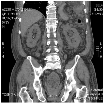 Hombre de 71 años que ingresó por lesión renal aguda y acidosis metabólica. Antecedentes de alcoholismo y tabaquismo durante 20 años, que suspendió hace 26 años. Diabetes mellitus tipo 2 de 15 años de evolución en tratamiento con pioglitazona, nefropatía diabética de 9 meses de evolución clasificada como KDIGO 3a, hipertensión arterial sistémica diagnosticada un año previo a su ingreso en tratamiento con clortalidona 12,5 mg/día y enalapril 10 mg cada 12 horas. Nueve meses antes de su ingreso presentó un infarto agudo de miocardio que ameritó intervención coronaria percutánea y colocación de un stent a la arteria coronaria derecha. Durante esa hospitalización presentó complicaciones hemodinámicas y requirió ventilación mecánica invasiva. Durante la hospitalización por el infarto agudo de miocardio se diagnosticó tuberculosis pulmonar, para la cual recibió tratamiento con antituberculosos en fase intensiva y de sostén por 2 y 4 meses respectivamente, con curación bacteriológica.