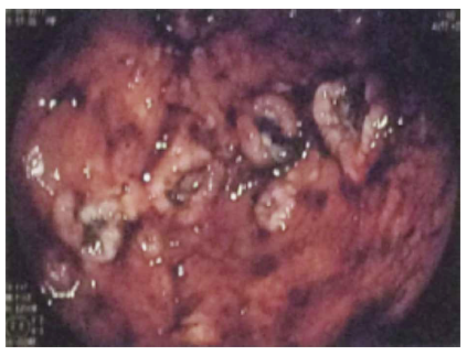 Inició cuatro días antes de su ingreso con deposiciones líquidas, náuseas, vómitos e intolerancia a líquidos. A su ingreso el paciente presentaba deshidratación severa. Tensión arterial de 90/50 mmHg, frecuencia cardíaca de 105 latidos/min, frecuencia respiratoria 28 respiraciones/min, temperatura 36°C. Somnoliento, pero reactivo. El abdomen presentaba peristaltismo disminuido, hepatomegalia de 2 cm por debajo del reborde costal, sin irritación peritoneal. Examen de miembros inferiores con edemas hasta los tobillos.