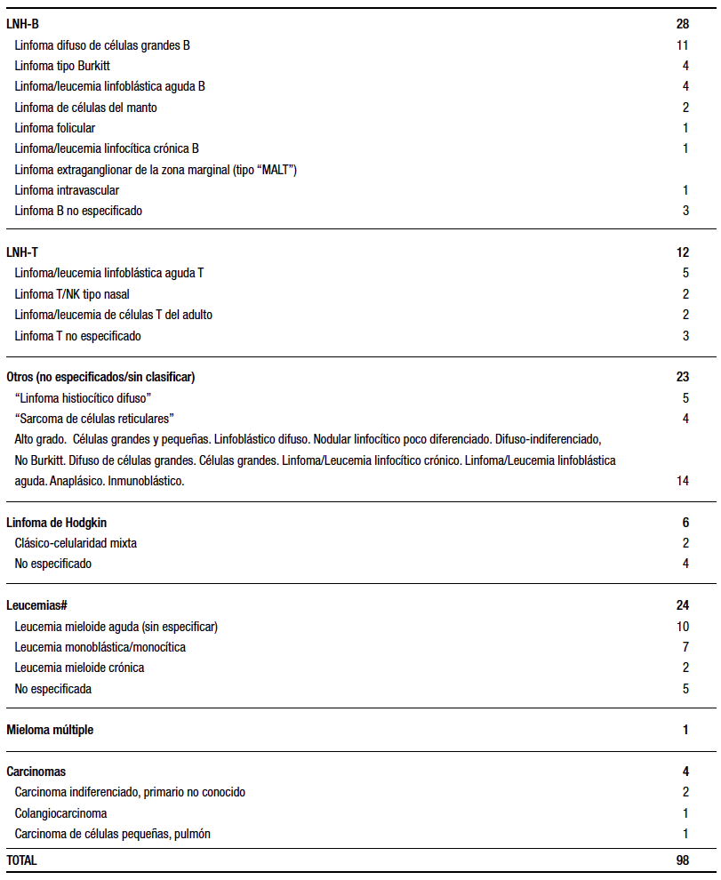 Se desconoce con exactitud la incidencia de pacientes con neoplasias hematológicas y ALB, aunque si se ha determinado es que es más frecuente en adultos y está asociada a mal pronóstico.50 En la Tabla 3 se muestran los tipos histológicos de las neoplasias en pacientes con ALB secundaria, obtenidos de 4 series con el mayor número de casos informados.23, 51, 57 Este análisis nos conduce a la observación de que los linfomas en general, particularmente el linfoma difuso de células grandes B (LDCGB), en conjunto con las leucemias, son las entidades que con mayor frecuencia se asocian a ALB, como reflejo de que estas representan las neoplasias hematopoyéticas de mayor prevalencia mundial.58 Además de las entidades ya mencionadas, también se han visto asociados excepcionalmente el mieloma múltiple y algunos carcinomas.