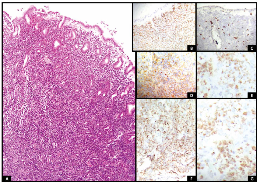 Se descartaron otras causas posibles de acidosis láctica como hipoxemia, insuficiencia hepática, intoxicaciones y deficiencia de tiamina. Una tomografía de abdomen (Figura 1) descartó isquemia intestinal, evidenciando múltiples adenopatías mesentéricas y retroperitoneales, por lo que se programó la biopsia de ganglio. Previo a la realización del procedimiento, el paciente presentó una hemorragia de tubo digestivo alto y descenso de la hemoglobina de 2 gr/dL en 24 horas, con repercusión hemodinámica que respondió a líquidos intravenosos y transfusión de hemoderivados. Recibió también tiamina por vía endovenosa. La endoscopía (Figura 2) mostró múltiples úlceras en la mucosa gástrica, sospechosas de linfoma, sin evidencia de hemorragia activa. El análisis histopatológico de las biopsias endoscópicas de la mucosa gástrica demostró infiltrado difuso de la lámina propia, constituido por mantos amplios de células grandes con escaso citoplasma, núcleos ovoides con morfología de centroblastos y ocasionalmente inmunoblastos que sustituían el epitelio glandular gástrico parcialmente; escasas glándulas presentaban lesión linfoepitelial; no se observó patrón de crecimiento nodular. Resultado de inmunohistoquímica: CD20+, CD3-, CD10+, Bcl-6+, Bcl-2+, P53+, LMP1-, CD30-, CD5-, citoqueratinas (AE1/AE3) negativas, cromogranina A-, Ki67=70%; que corresponden a linfoma difuso de células grandes B, tipo centro germinal (Figura 3). El paciente fue enviado para su valoración al hospital de Oncología, sin embargo, falleció antes del inicio de la quimioterapia. No se realizó necropsia.