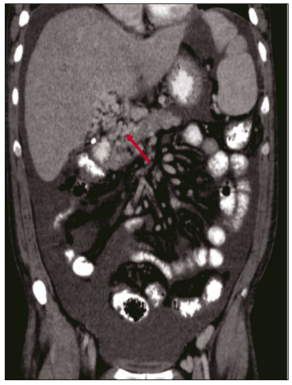 Extravascular volume overload is one of the most common manifestations of POEMS, characterized by peripheral edemas, pleural effusion, ascites, and pericardial effusion. The association between ascites and POEMS is present in 23-48% of patients; however, the available information on the pathogenesis and the physico-chemical characteristics of ascitic fluid in those patients remains scarce. One of the largest series of studies on ascitic fluid in POEMS patients was conducted by Cui et al.5 In this study that include 106 patients with POEMS, 39% of them presented ascites. All patients had SAAG < 11g/L, which is compatible with exudate, suggesting an abnormal permeability of capillaries in the visceral peritoneum. In addition, there were no cases portal thrombosis or hepatic vein thrombosis according to Doppler evaluation.5 Only 5 cases of POEMS syndrome with portal hypertension have been reported, four of them with evidence of non-cirrhotic portal fibrosis,6, 7, 8, 9,10 and one with unknown mechanism.11 Nevertheles, in none of them portal thrombosis was demonstrated. Although POEMS patients have an increased risk of venous and arterial thrombosis of about 20%, there are no cases that reported portal cavernomatosis as a manifestation.2, 6, 12 There was described only one case of a patient with POEMS syndrome, who developed portal thrombosis during the chemotherapy treatment,13 and there are few cases associated to Budd-Chiari syndrome.14,15 Several factors as progressive fibrosis of the portal veins, acquired vascular defect, exposure to several toxins or infections, immunological basis, aberrations in the thrombin-antithrombin complex and elevations of inflammatory cytokines, such as VEGF, Interleukin-1b, Interleukin-6, Interleukin-12 and tumor necrosis factor-a that are increased in POEMS syndrome may be related with the underlying mechanism of POEMS syndrome and portal hypertension.11