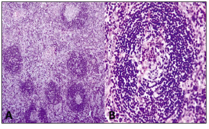 Due to the absence of etiology diagnosis, a laparotomy was conducted, hepatic and peritoneal biopsies were performed and the left inguinal lymphadenophaty was excised. Their mycrobiological cultures and CRP for Mycobacterium tuberculosis and Histoplasma capsulatum were negative. The patho-logy analysis of the inguinal lymphadenophaty revealed the presence of vessels in central position, surrounded by lymphocytes in crown-like structures, reminiscent of the hyaline vascular Castleman disease (Figure 2).