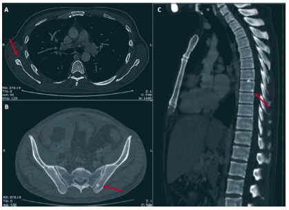 The hepatic and peritoneal biopsy showed normal findings and amyloid deposit was negative in both biopsies. The serum immunofixation test showed an IgA lambda biclonal band, while urine serum test was negative. The free kappa and lambda light chains concentrations were 67.31 mg/l (NV: 3.30-19.40) and 84.36 (NV: 5.71-26.30) respectively, with a kappa/lambda ratio of 0.8 (NV: 0.26-1.65). A bone marrow biopsy showed hyperplasia and dysplastic changes, with erythroid predominance and mild plasmacytosis of 4.2%, of which 70.3% were aberrant (CD138+, CD38+, CD19-, CD45-, CD56+), compatible with plasma cells dyscrasia. After reviewing the previous computed tomography images, several osteosclerotic lesions were observed on the vertebral column, the scapula, and the hip bone. (Figure 3) Owing to the identification of polyneuropathy (compatible with axonal compromise), organomegaly (hepatosplenomegaly), potential endocrinopathy (indicative of suprarenal insufficiency), monoclonal component IgA Lambda, cutaneous hyperpigmentation, Castleman disease and osteosclerotic injuries, the patient was diagnosed with POEMS syndrome after 20 months of diagnostic evaluation.