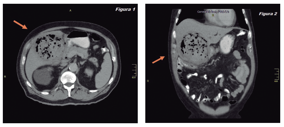 Paciente de 84 años con antecedentes de hipertensión arterial, diabetes mellitus tipo 2, insuficiencia cardíaca y fibrilación auricular, medicado con enalapril, carvedilol, metformina y acenocumarol. Acude al servicio de emergencia de nuestra institución por un cuadro de 24 horas de evolución de dolor abdominal en hipocondrio derecho, fiebre y vómitos. Examen físico: abdomen tenso, doloroso a la palpación en hipocondrio derecho con defensa y reacción peritoneal. Laboratorio: leucocitos 19.000/mm³, plaquetas 205.000/mm³, bilirrubina total: 1,7 mg/dl, bilirrubina directa: 1 mg/dl, TGO: 165 U/L, TGP: 156 U/L, fosfatasa alcalina: 386 U/L, tiempo de protrombina: 35%, KPTT: 15”; el resto sin alteraciones. Ecografía abdominal: vesícula distendida, paredes engrosadas, contenido ecogénico difuso con componente gaseoso que no proyecta sombra acústica posterior. Se efectuó una tomografía computada abdominal (TCA) cuyos hallazgos son motivo de esta presentación (Figuras 1 y 2).