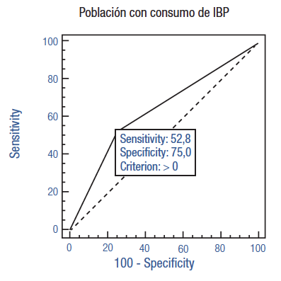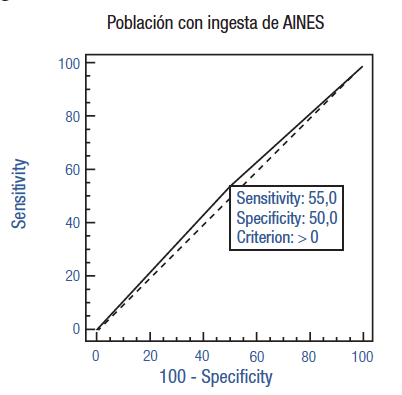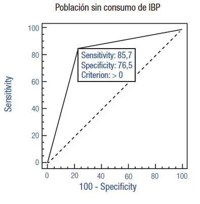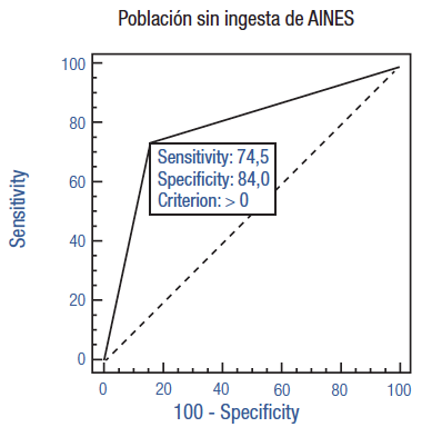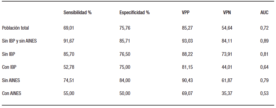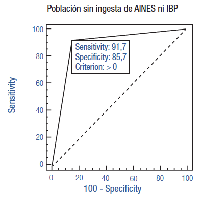 La sensibilidad es del 92%, la especificidad del 86% y los VPP y VPN del 93% y 84% respectivamente cuando se estudia a pacientes vírgenes de AINES e IBP. Estos valores se modifican notablemente según la subpoblación estudiada.