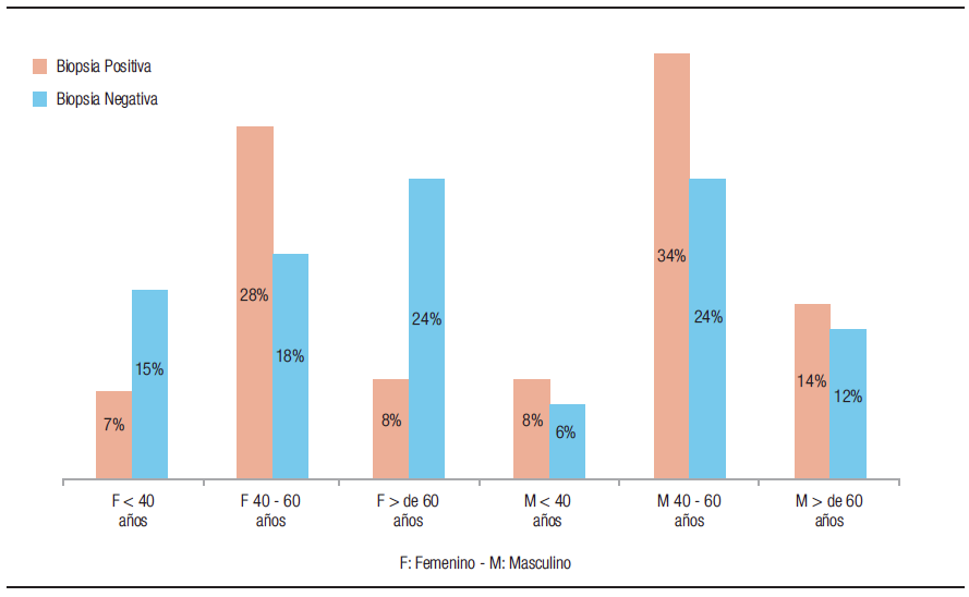 De los 104 pacientes que cumplían los criterios para participar en el estudio, la distribución según el sexo fue de 48% para mujeres y 52% para hombres, con una mediana de edad de 51 años (rango: 17-73). La mayor prevalencia de H. pylori se produce en el rango de edad de 40 a 60 años en ambos sexos, pero es mayor en hombres que en mujeres (Figura 1).