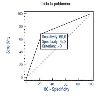 La sensibilidad y la especificidad del test de detección de AgHp en toda la población estudiada son aceptables, 69% y 76% respectivamente (Figura 2a). El alto valor predictivo positivo (VPP) indica que el 85% de las veces el test será positivo para pacientes que se encuentren colonizados por H. pylori, avalando la manifestación de síntomas del tracto digestivo superior, a pesar del consumo de IBP y/o AINES, y correlacionando con la mayor especificidad (Tabla 2). Se puede afirmar entonces que se trata de un test específico. Con respecto al valor predictivo negativo (VPN), solo el 54% de las veces en que el paciente no esté colonizado, el test será negativo; lo que se corresponde con una menor sensibilidad (Tabla 2).