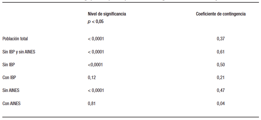 Con respecto al test de enzimoinmunoensayo, existe una asociación estadísticamente significativa entre la detección de AgHp en materia fecal y la detección de H. pylori por biopsia, para la población total (p < 0,0001), para aquellos pacientes vírgenes de IBP y AINES (p < 0,0001), para los que no consumen IBP (p < 0,0001) como así también para los que no ingieren AINES (p < 0,0001) (Tabla 1). Sin embargo, existe una muy baja exactitud diagnóstica en los pacientes consumidores de IBP (p = 0,12) como así también en aquellos que ingieren AINES (p = 0,81), demostrándose en estos últimos la peor situación (Tabla 1).