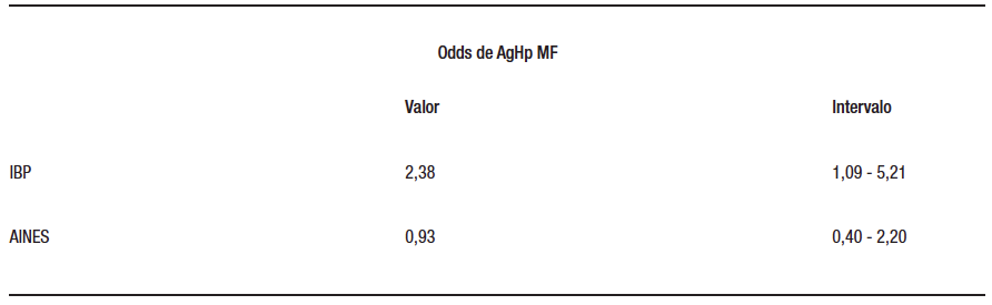 Asimismo, el coeficiente de Odds indica que existe menos probabilidad de tener un diagnóstico positivo de antígeno en materia fecal cuando se ingieren AINES (Tabla 3).