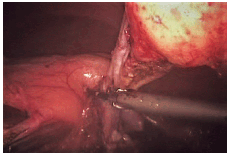 A conduta adotada foi o destelhamento do cisto por laparoscopia guiada através de video (Figuras 6 e 7). O local dessa massa tumoral, o hilo hepático, é uma região delicada, principalmente pela passagem da artéria hepática e da veia porta. A cirurgia foi concluída sem anormalidades e a paciente teve alta no segundo dia de pós-operatório.