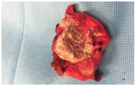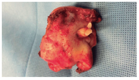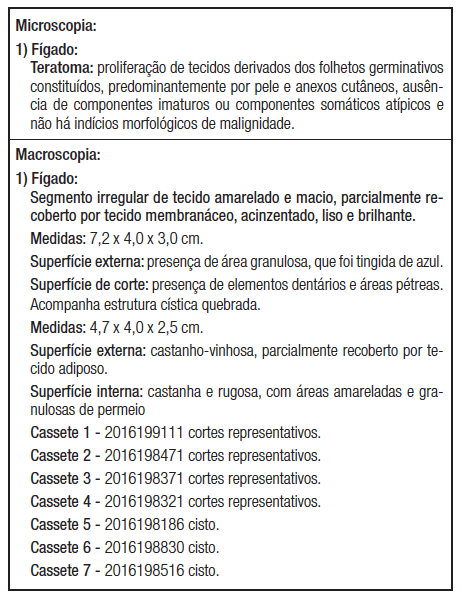 Registrou-se um teratoma hepático (Figuras 8 e 9 acima), de dimensões 7,2 x 4,0 x 3,0 cm. Segmento irregular de tecido amarelado e macio com presença de elementos dentários e de áreas pétreas.