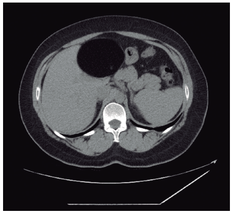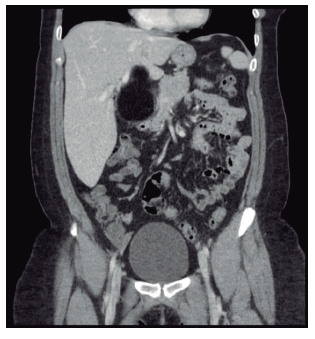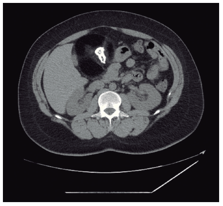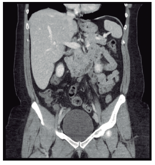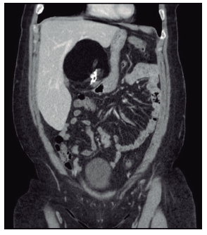 Relata-se o caso de uma mulher de 38 anos (altura 1,64 m e peso 80 kg), que apresentou sensação de empachamento e dor abdominal há seis meses. Não havia outros eventos prévios clinicamente significantes e a paciente também não apresentava comorbidades prévias associadas, com exceção ao seu sobrepeso (IMC = 29,7). Ela negava alergias, hábitos ou uso de medicamentos contínuos.