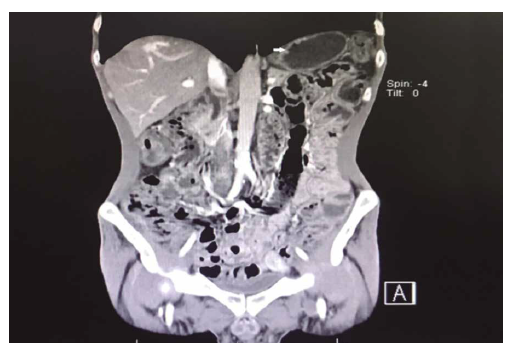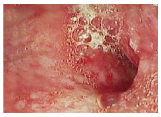Paciente de sexo masculino de 56 años que procede del área rural de Guayaquil, quien sin antecedentes patológicos personales ingresó por náuseas, vómitos alimentarios, diarrea y pérdida de peso de seis semanas de evolución. Examen físico: paciente con caquexia, IMC 16,7 (desnutrición II), abdomen blando y depresible. Laboratorio: leucocitos 9,000/mm3, neutrófilos 70%, eosinófilos 10%, linfocitos 20%, hemoglobina: 9 mg/dL, plaquetas 232,000/mm3, sodio: 124 meq/L, potasio 3,5 meq/L, HIV negativo, CEA: 2 ng/ml, CA 19-9: 20 U/ml, el resto de los exámenes normales. Se realizó una videoendoscopía alta: esófago y duodeno normales; estómago: falta de pliegues y ausencia de distensibilidad a pesar de la insuflación máxima, la mucosa antral con pérdida del patrón mucoso de aspecto engrosada, congestiva con deformación del píloro. Se tomaron múltiples biopsias; macroscópicamente se sospechó una linitis plástica (Figura 1). Sin embargo, la tomografía de abdomen contrastada no evidenciaba engrosamiento de la pared gástrica (Figura 2).