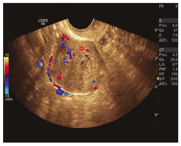 Se realiza una endoscopía alta: se describe el estómago con eritema difuso incipiente en la mucosa de cuerpo y el duodeno con abundante contenido bilioso; las demás estructuras sin alteraciones. Impresión diagnóstica: gastritis superficial leve. Se realiza una colonoscopía: lesión elevada a 20 cm de la válvula ileocecal correspondiente a un adenoma tubular según estudio de anatomía patológica. También se realiza una ecografía abdominal: hígado con leve aspecto esteatósico, vesícula biliar ausente, resto de las estructuras sin alteraciones. Se observa una masa sólida de bordes definidos de 60 x 40 mm, de ubicación paravesical derecha que no llega a contactarla, impresiona en contacto con el fondo uterino que muestra vascularización, se destaca una imagen fistulosa periférica a la lesión (Figura 1).